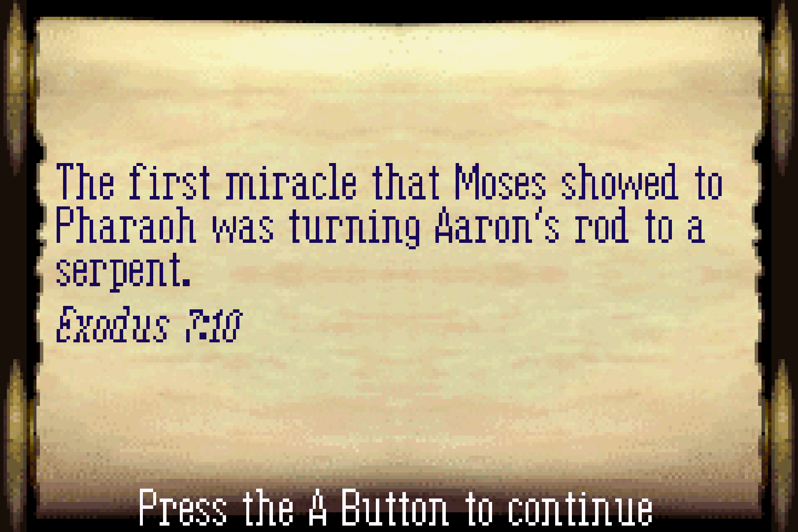 Now, obviously this being a game about the Bible, a big part of the game is educating its players about the titular book. It’s education disguised as entertainment, nothing more, but all the more power to them for making a GBA game the delivery method. The big issue with using the game’s knowledge quiz as the central mechanic of the entire experience is more a matter of numbers than anything else.