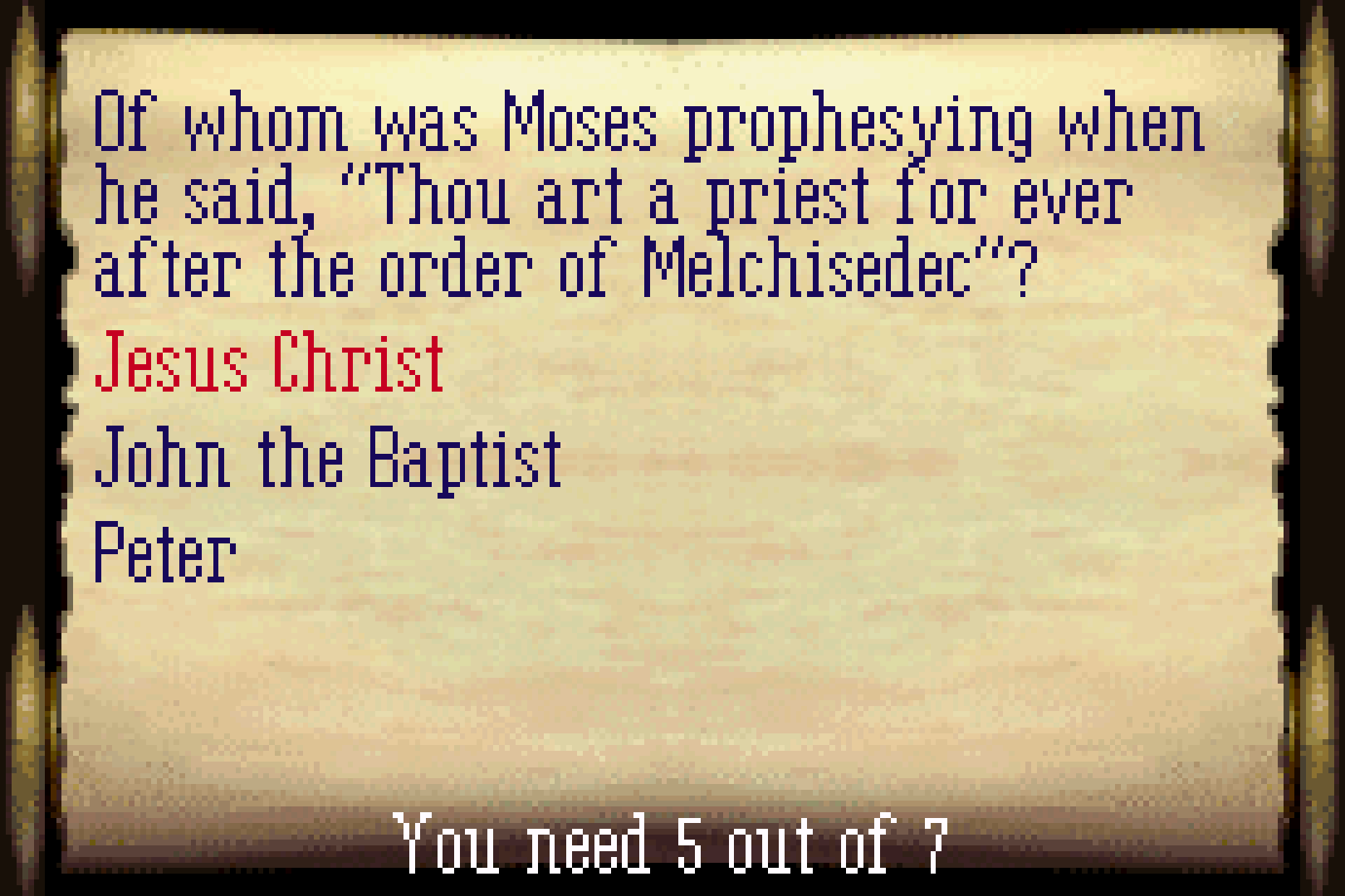 At first, you'll only have to answer a handful of questions out of the total provided by correctly to ‘defeat’ the first couple tricksters, but this number balloons as the game progresses, requiring more and more answers of any given total set of questions to win. And, as far as I can tell, the vast majority of the Tricksters provide unique questions, so by game’s end, you’ll need to have known - or more likely, looked up - the answers to hundreds - if not over a thousand - of bible-related questions. I think this problem was meant to have one of three solutions: