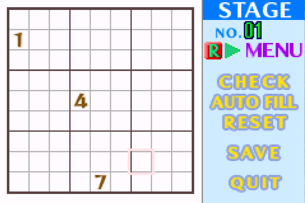As someone who suffers from heavy tunnel vision during puzzles, not getting screwed over because I didn’t notice that 9 was already in the box I’m repeatedly trying to slam it in like a baby who doesn’t realise the ball does not go in the square hole… Uh, what I’m saying, it’s nice that Dr. Sudoku takes a gentler hand and just tells you that it doesn’t work, nothing more. If this was a ‘three strikes and you’re out’ kind of game, I probably wouldn't have gotten as far as I did in my hours with the title. I like to think I’m not stupid, but I’m quick enough to make dumb mistakes that’d I’d be crashing out on the simplest of puzzles. It’s perhaps not 100% accurate to how you’d play with paper and pencil, but I don’t really mind in the more chill-out form on the Game Boy Advance.