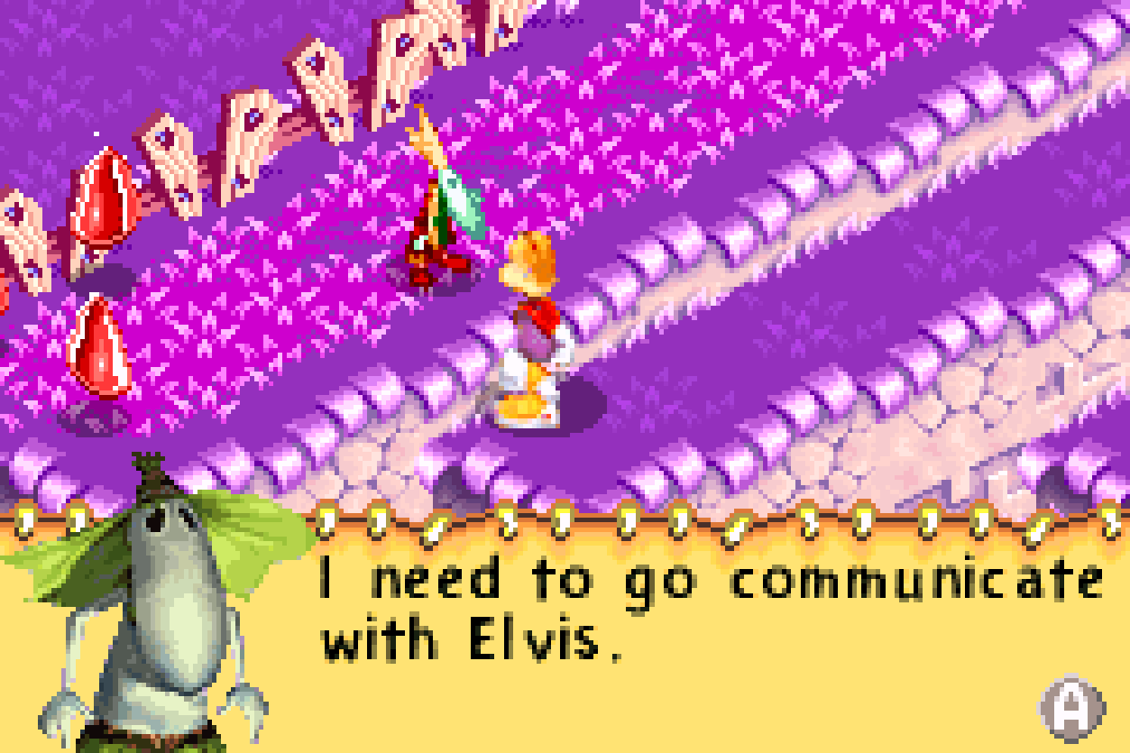 For a platformer on the GBA, it might as well be War & Peace with it having *actual* writing being present. The bar has officially sunk below the floor and entered deep within the earth’s crust. Taking place after the events of Rayman 3: Hoodlum Havoc (so NOT the Rayman 3 on the actual GBA - that’d be silly, no?) Rayman’s large, oddly shaped friend Globox accidentally eats a Dark Lum - basically an evil fairy - possessing him and causing him to charge off, leading Rayman to go hunting for his wayward friend. As someone who hasn’t played Hoodlum Havoc, I don’t really know what the Dark Lum’s plans are - something to do with prune juice, guys who look like ancient knights, and the heart of the world, but there’s enough writing here to set things up. Look, after the amount I’ve played, I’ll take anything.